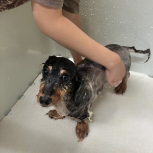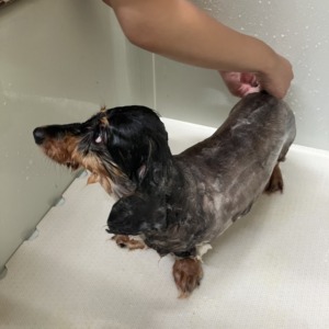 不要な毛をバリカンで落とし、爪切りの後にシャンプー。