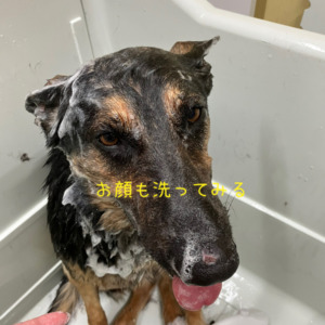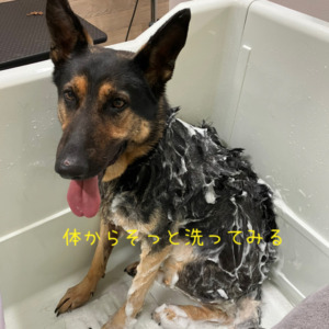 日頃、水浴び大好きと言うことで、体からそっと洗いはじめ、最後顔を。